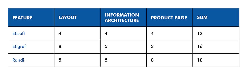 W ramach analizy konkurencji stworzyłam diagram oceny dla Etisoft i dwóch firm konkurencyjnych, stosując skalę 0-10 punktów. Poprosiłam kilka osób o ocenę stron na podstawie pytań: „Czy łatwo znajdujesz to, czego szukasz?”, „Czy bez znajomości tematu wiedziałbyś, co i jak zamówić?”, „Jakie jest Twoje ogólne wrażenie (1-10)?”. Wyniki pokazały, że konkurencja również ma wiele do poprawy.