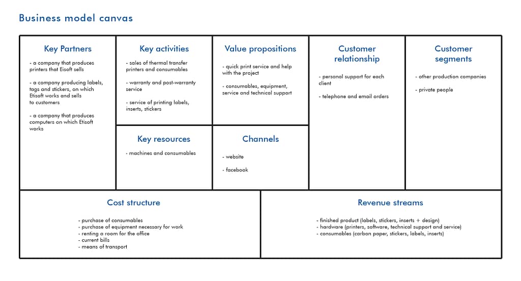Następnie przełożyłam wizję produktu na model biznesowy, opisując klientów, ich relacje z produktem, kanały dotarcia, propozycję wartości, kluczowe działania, niezbędne zasoby, partnerów, generowane koszty oraz potencjalne przychody. Etisoft działa głównie w modelu B2B (biznes do biznesu), kierując ofertę do innych firm, ale również dąży do pozyskiwania klientów indywidualnych (B2C). Produkt wpisuje się w model E-commerce (sprzedaży online).