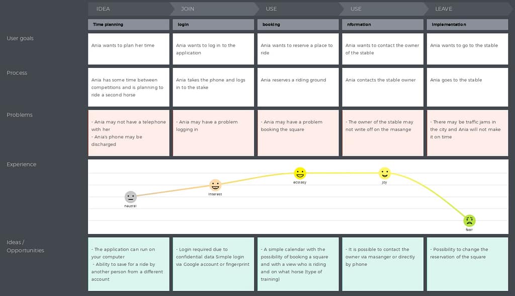 Aby stworzyć mapę podróży użytkownika, musiałam przemyśleć, jak i kiedy ją zrealizować. Ponieważ projekt jest teoretyczny i nie dysponowałam środkami na prawdziwe badania, ponownie skorzystałam z pomocy przyjaciół z środowiska jeździeckiego. Mapę udało się opracować podczas jednego z wyjazdów na zawody, kiedy zebraliśmy się w większej grupie. Stworzyliśmy wizualną interpretację relacji między produktem a użytkownikiem. Ustaliliśmy cel, jaki nasza persona – Ania – chce osiągnąć: Ania jest na zawodach z jednym koniem, drugi został w stajni. Między zawodami ma trochę czasu i chciałaby pojechać do stajni, aby pojeździć na drugim koniu. Potrzebuje zarezerwować plac do jazdy i skontaktować się z właścicielem, aby wypuścił konia z padoku.