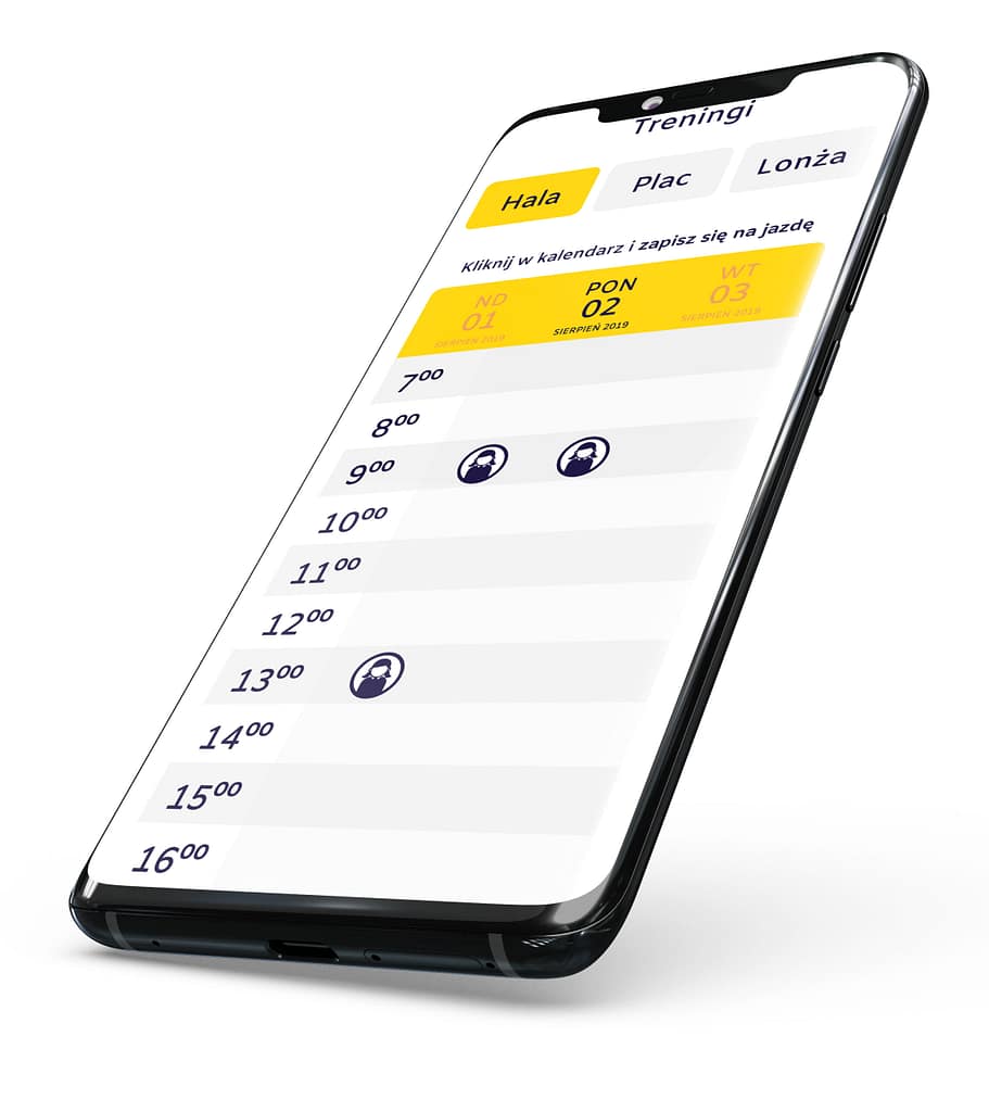 Trening: Niektóre stajnie ograniczają liczbę koni na placu lub w hali, aby zapewnić bezpieczeństwo podczas jazdy. Aplikacja ułatwia zapisywanie się na treningi. Użytkownik może wybrać miejsce treningu (plac zewnętrzny, hala, lonżownik) oraz typ treningu (jazda indywidualna lub trening). Możliwe jest zapisanie na jazdę innego użytkownika – to przydatne, gdy telefon się rozładuje i potrzebna jest pomoc.